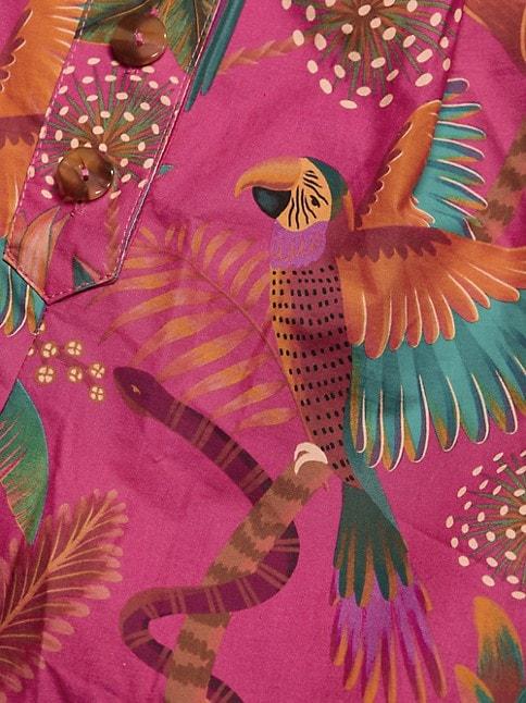 Macaw Party Belted Suit features a V-neck bodice with ruffled short puff sleeves. Ladder-lace trim and a matching O-ring belt elevated this bright, printed style.
